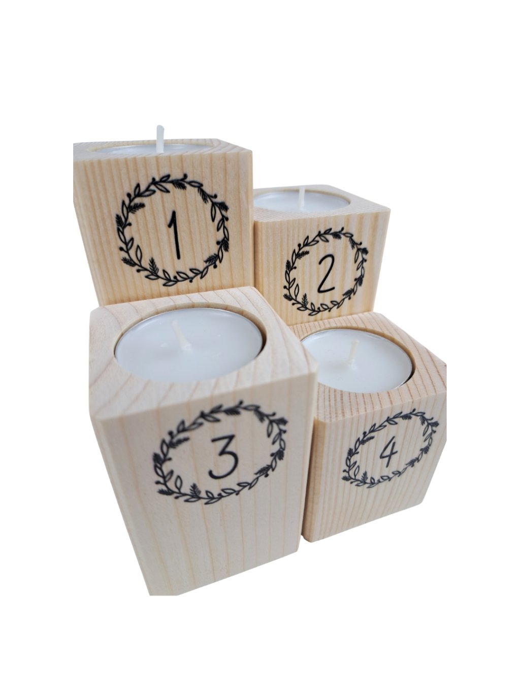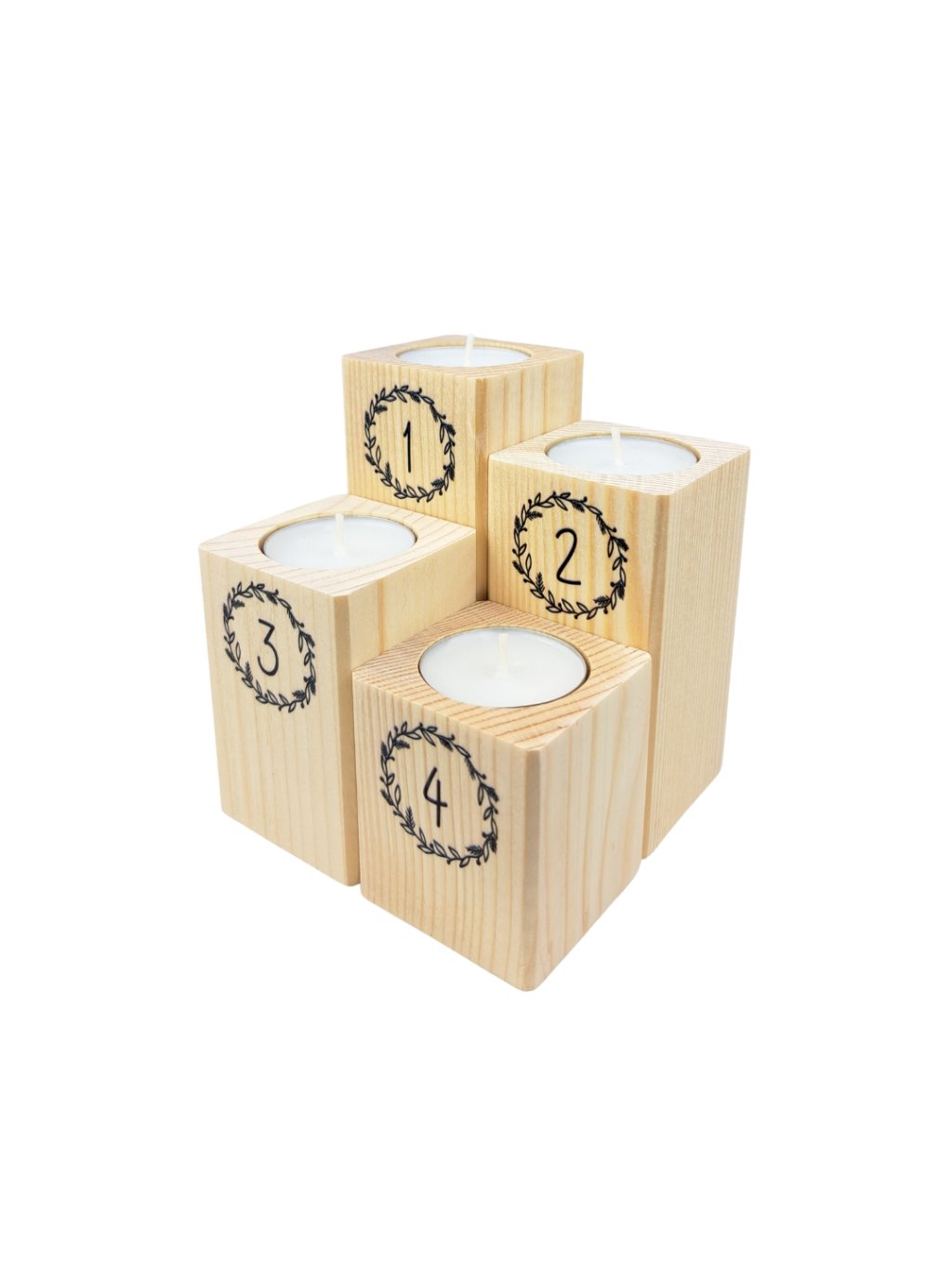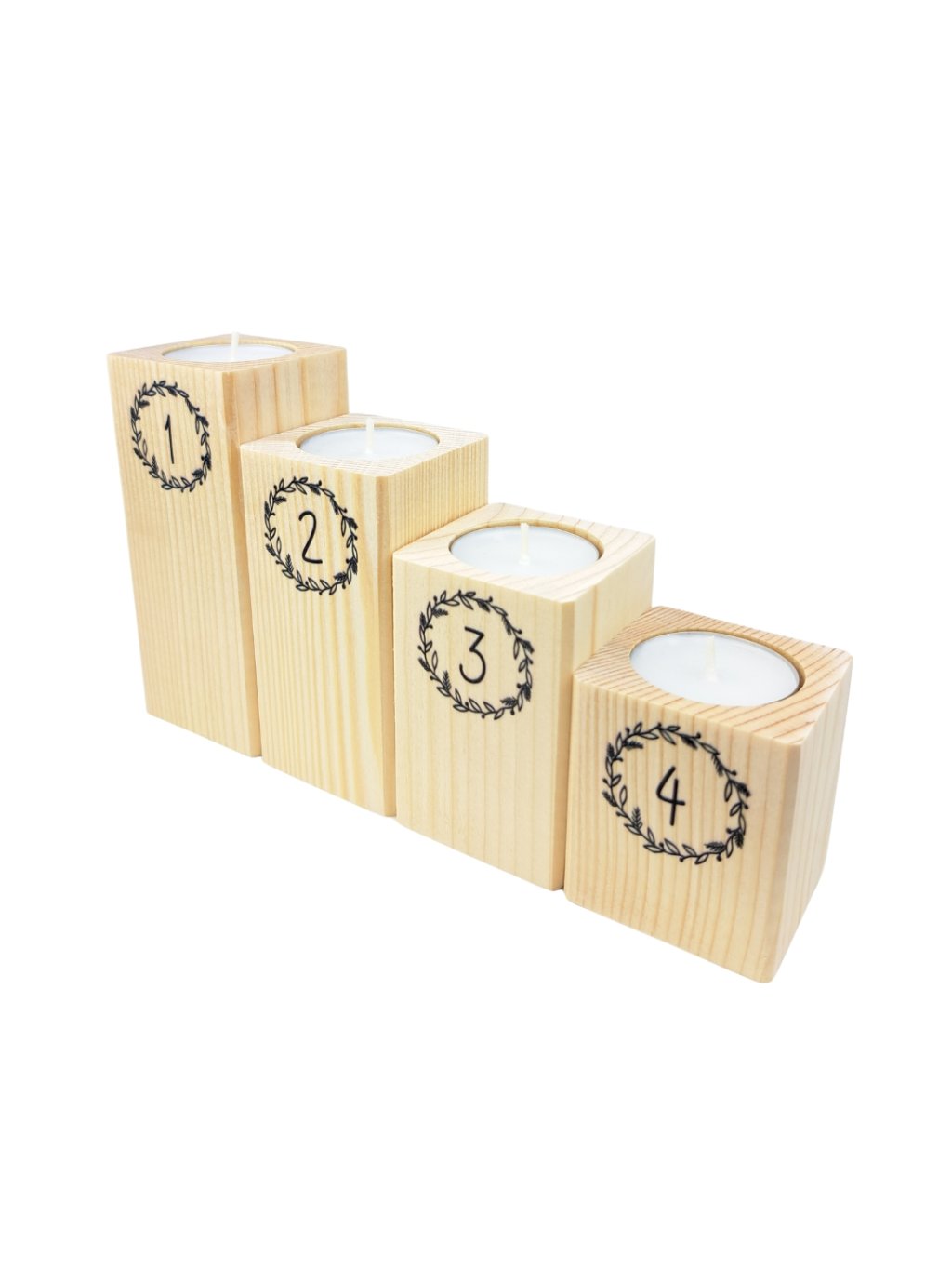 Sada obsahuje 4 drevené svietniky s rozmermi 6,8,10,12x5,4 cm +-1mm spolu s čajovými sviečkami.