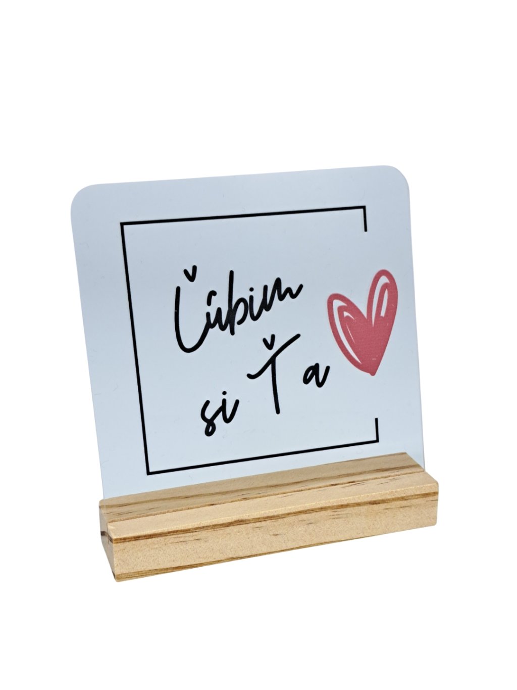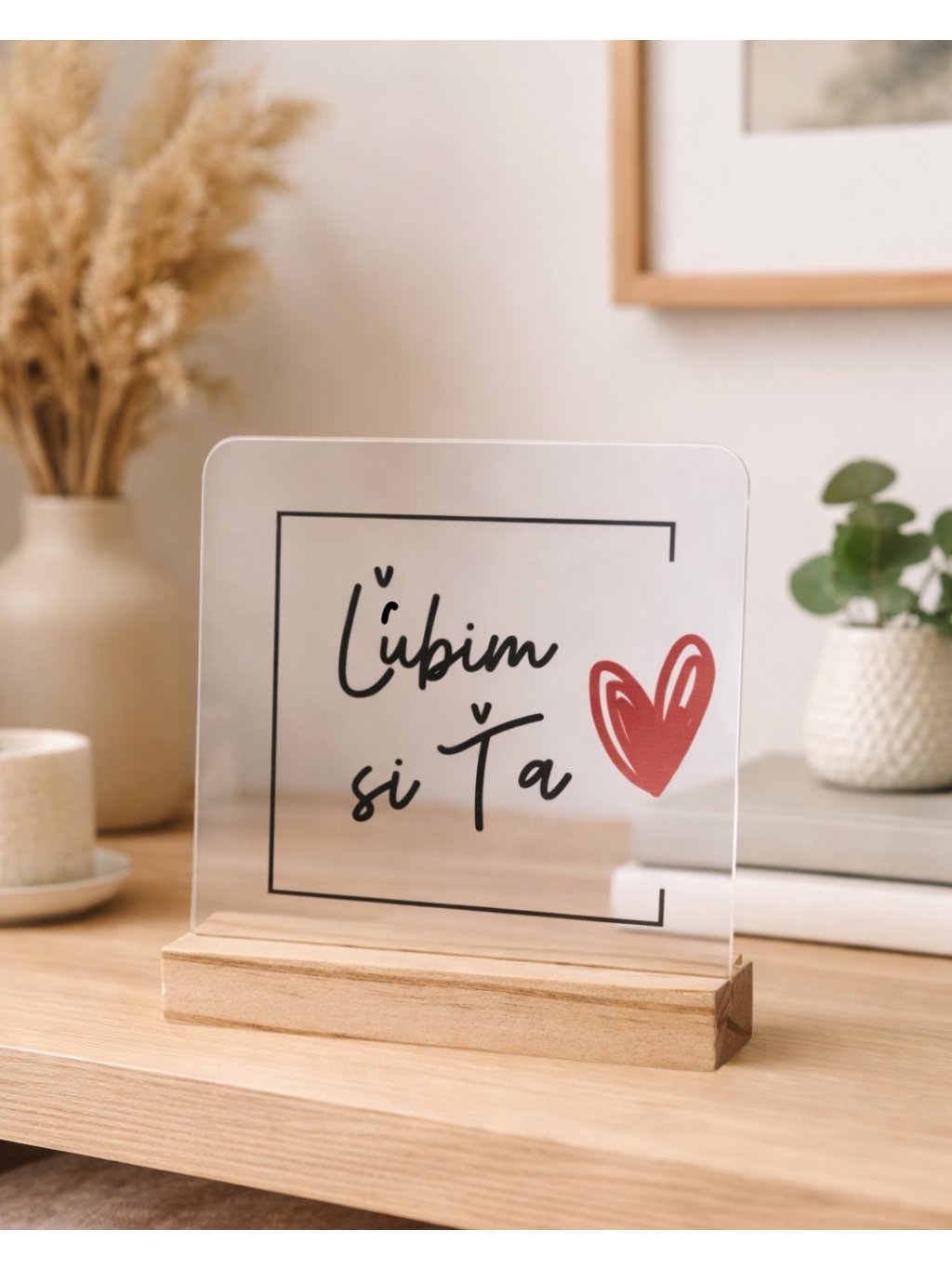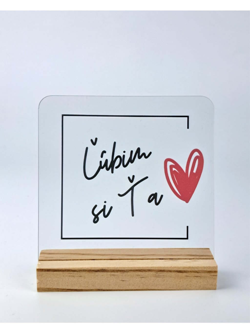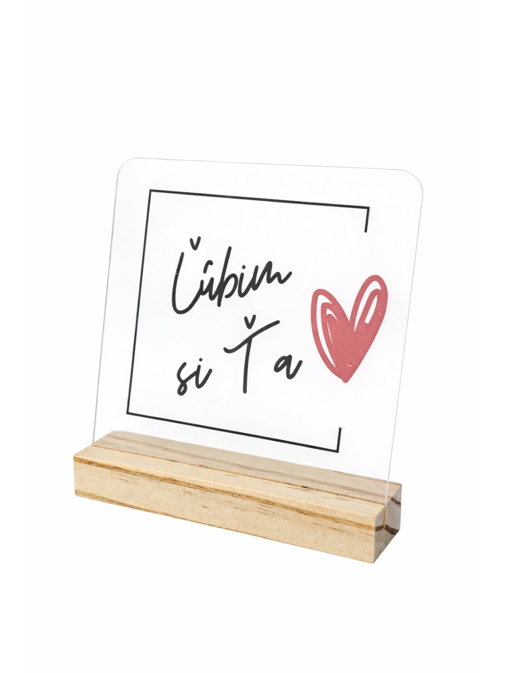 Vďaka možnosti zadať vlastný text vzniká jedinečný darček vytvorený presne na mieru obdarovanému. Priehľadné akrylové sklo pôsobí moderne a elegantne, zatiaľ čo drevený stojan dodáva produktu teplo a prirodzený vzhľad. Spolu tvoria harmonickú dekoráciu, ktorá zapadne do každého interiéru.