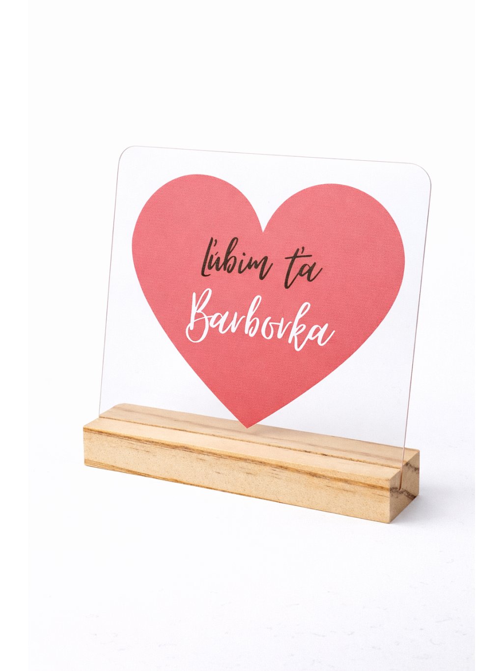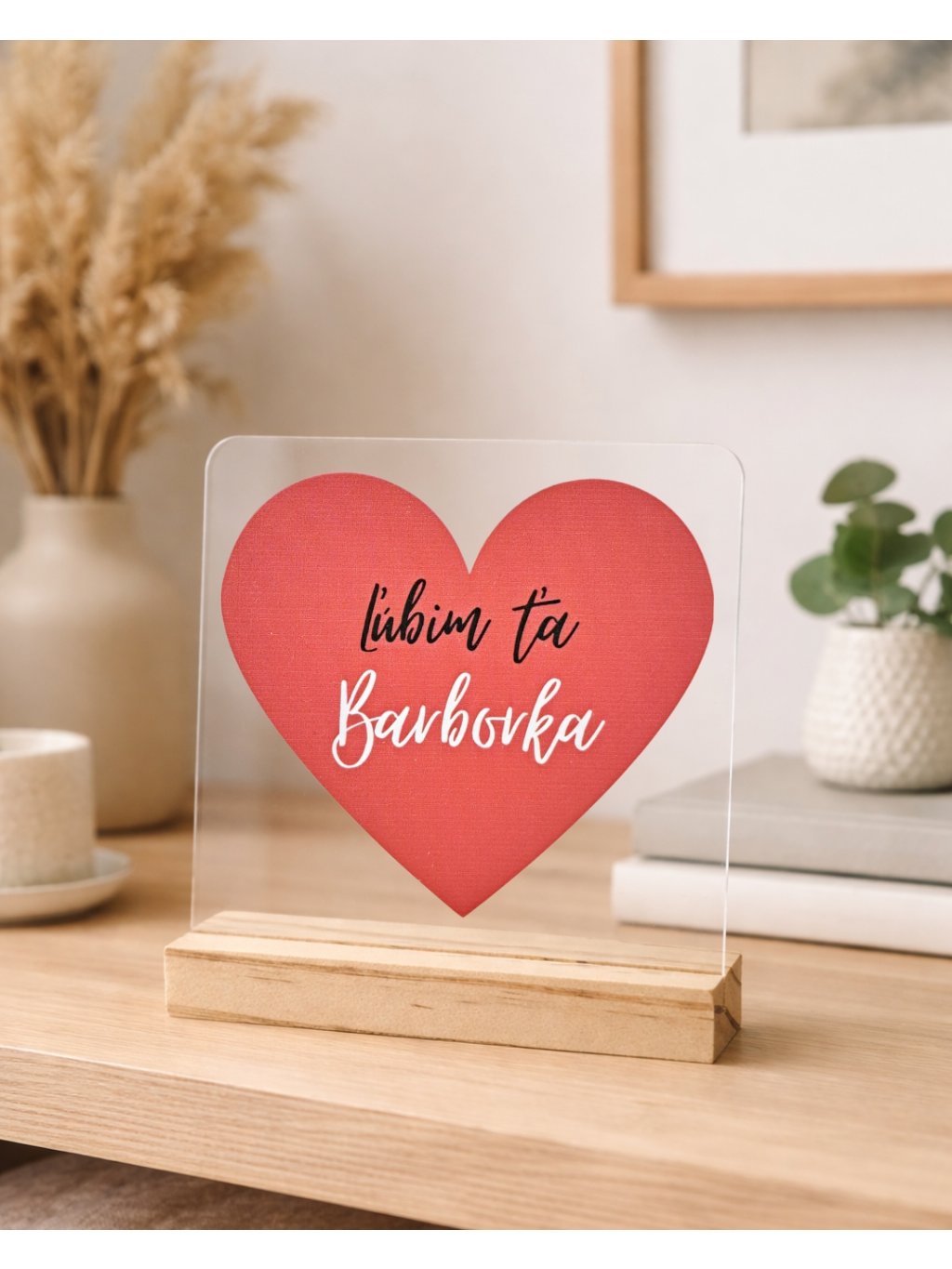 Vďaka možnosti zadať vlastný text vzniká jedinečný darček vytvorený presne na mieru obdarovanému. Priehľadné akrylové sklo pôsobí moderne a elegantne, zatiaľ čo drevený stojan dodáva produktu teplo a prirodzený vzhľad. Spolu tvoria harmonickú dekoráciu, ktorá zapadne do každého interiéru.