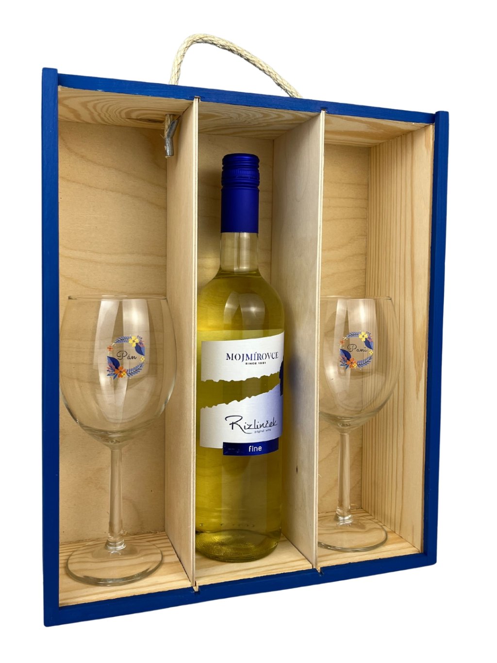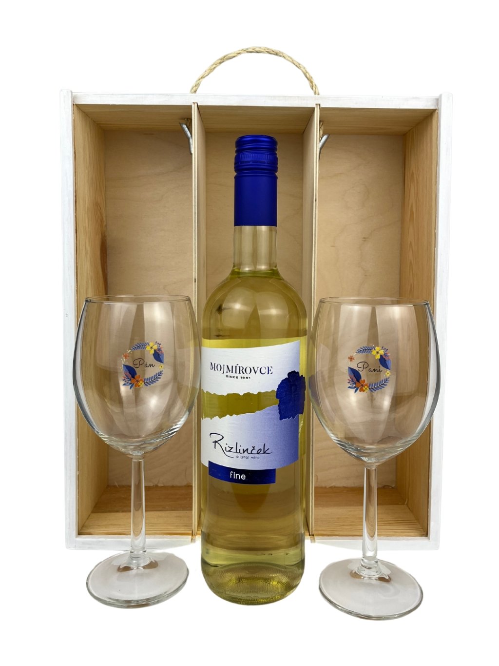Krabička je doladená bielym vínom z malého rodinného vinárstva Vinhor a krásnymi pohármi na víno, ktoré vytvoria chvíle pohody v manželskom živote.