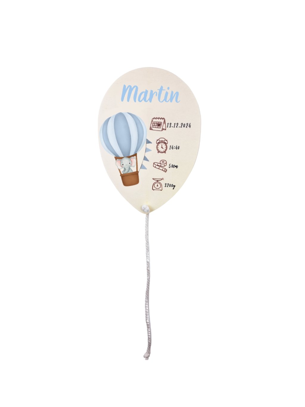 Originálna drevená dekorácia v tvare balónika, ktorá krásne doplní detskú izbičku a zároveň uchová tie najdôležitejšie spomienky na narodenie vášho bábätka. Na balóniku sú uvedené všetky základné údaje – dátum narodenia, čas, pôrodná hmotnosť a dĺžka, spolu s menom dieťatka.