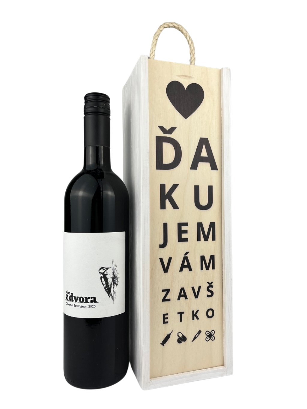 Túto originálnu krabičku dopĺňa červené víno vo farbe krvi, ktoré má taktiež výstižný motív - ďateľ ako lekár stromov.
