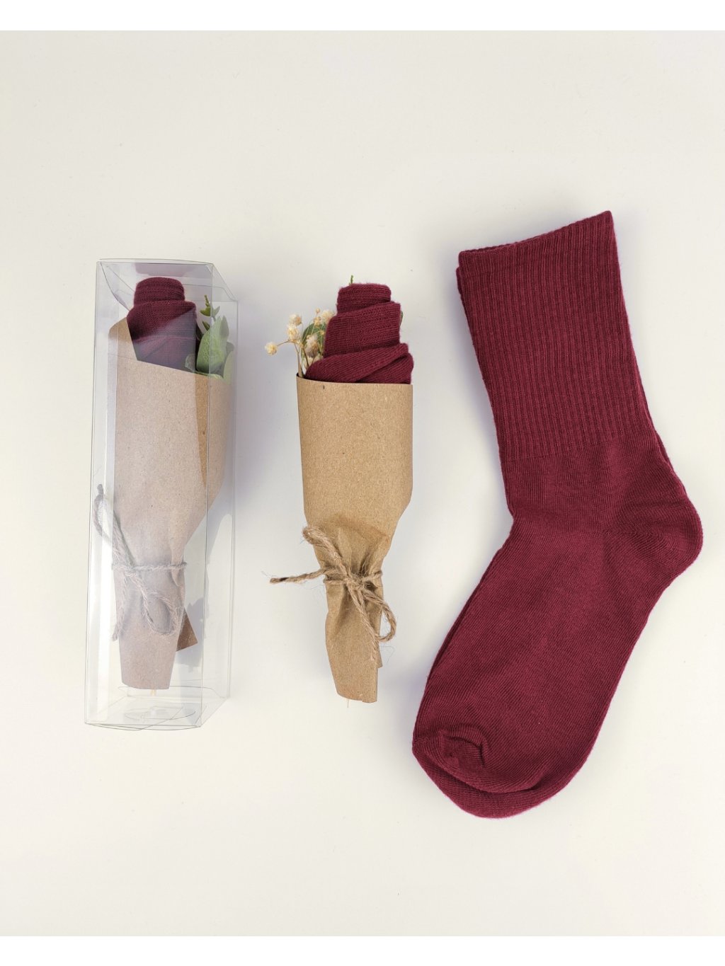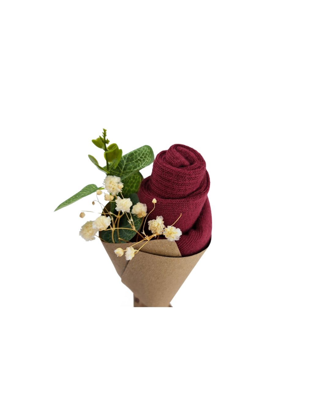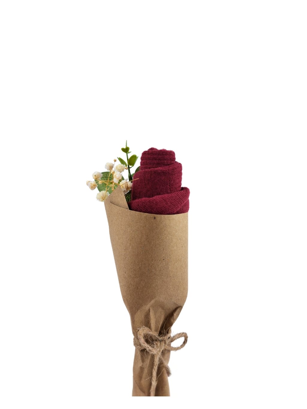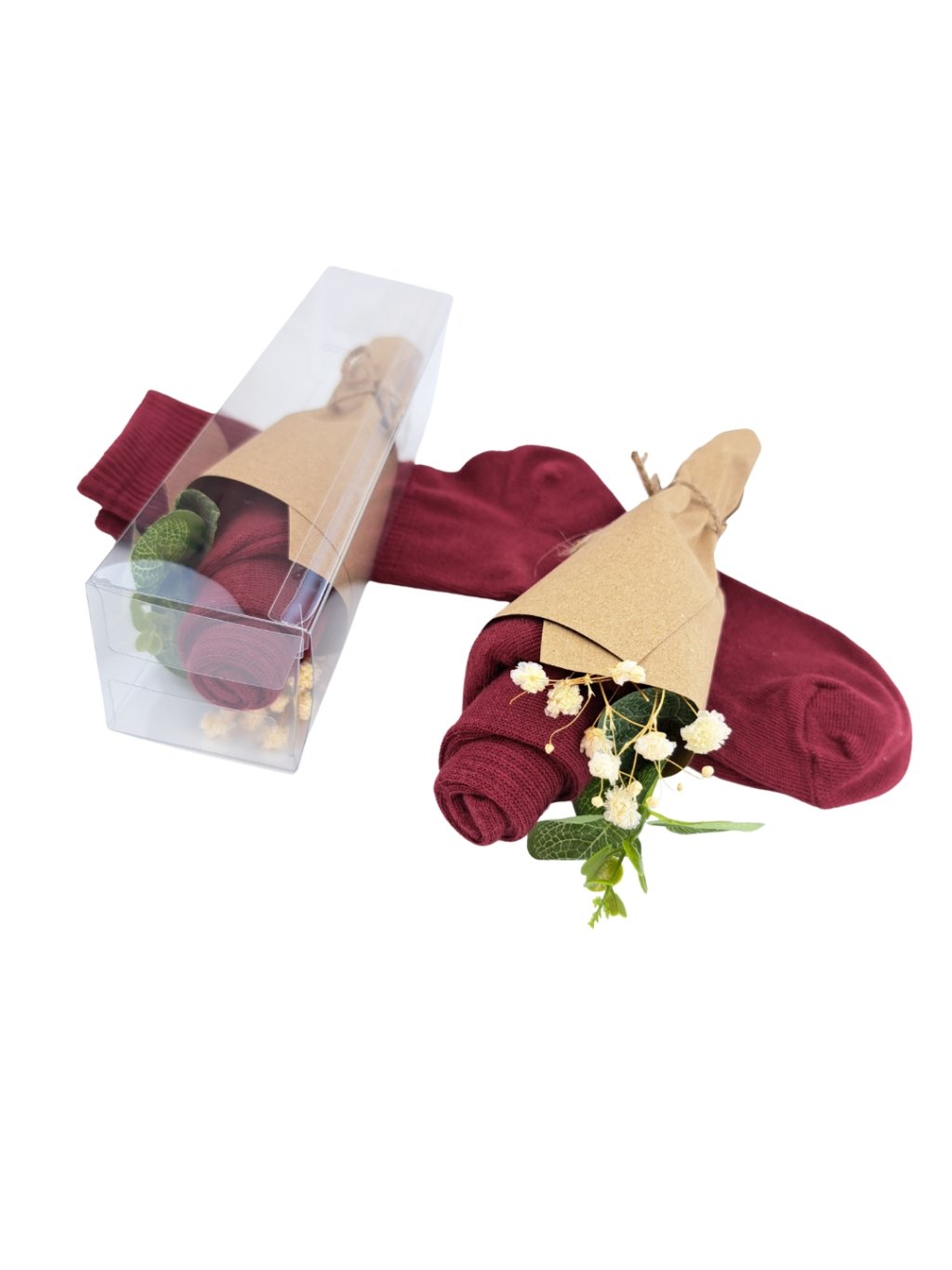 Originálna ponožková kytica je vytvorená z jedného páru kvalitných bordových ponožiek, ktoré sú naaranžované do tvaru ruže. V kombinácii so sušenými bielymi gypsomilkami a jemnou zelenou dekoráciou s lístkami vzniká jedinečná a elegantná kytička.
