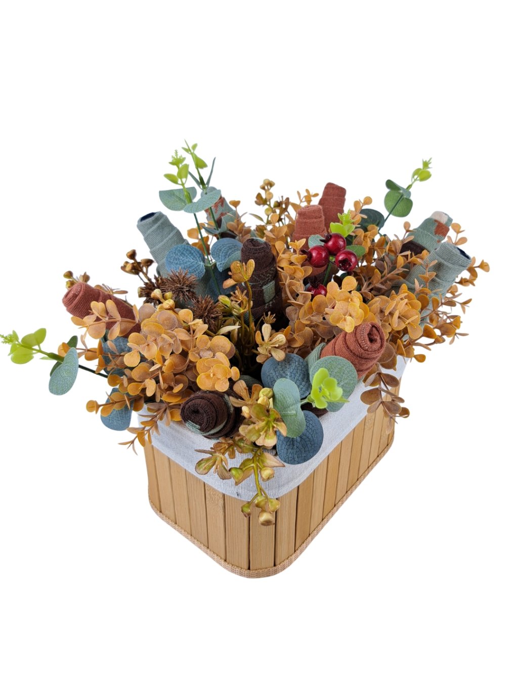 Originálna pánska ponožková kytica v prírodných odtieňoch z kvalitných bavlnených ponožiek je spojením elegancie, praktickosti a nápaditosti.