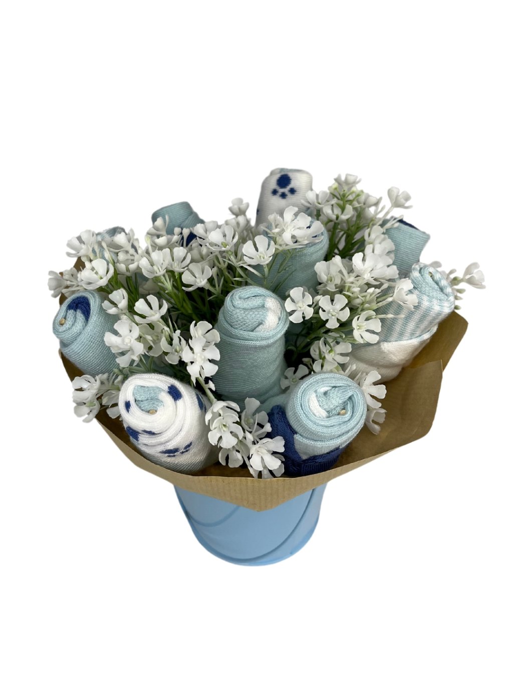 Čakajú ťa krstiny či oslava narodenia chlapčeka a rozmýšľaš nad originálnym darčekom? Tento nádherný set trojkrabičky s ponožkovou kyticou je ideálnym darčekom, ktorý zhmotní spomienku na tieto zázračné chvíle a vyčarí úsmev na tvári, zakaždým keď sa naňho pozriete.