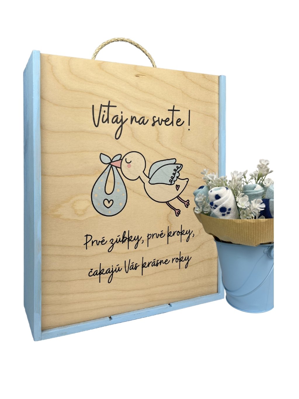 Ponožková kytička z baby modrých bavlnených ponožiek je ideálnym darčekom pre všetky bábätká. Poteší očká a zahreje nôžky. Modrá trojkrabička je doladená bielym vínom od slovenského vinárstva PD Mojmírovce a veselými pohármi na víno. Jeden pohár s obrázkom zúbka a druhý pohár s obrázkom nožičiek. Oba poháre vystihujú dôležité míľniky vo vývoji bábätka, ktoré je dôležité osláviť!