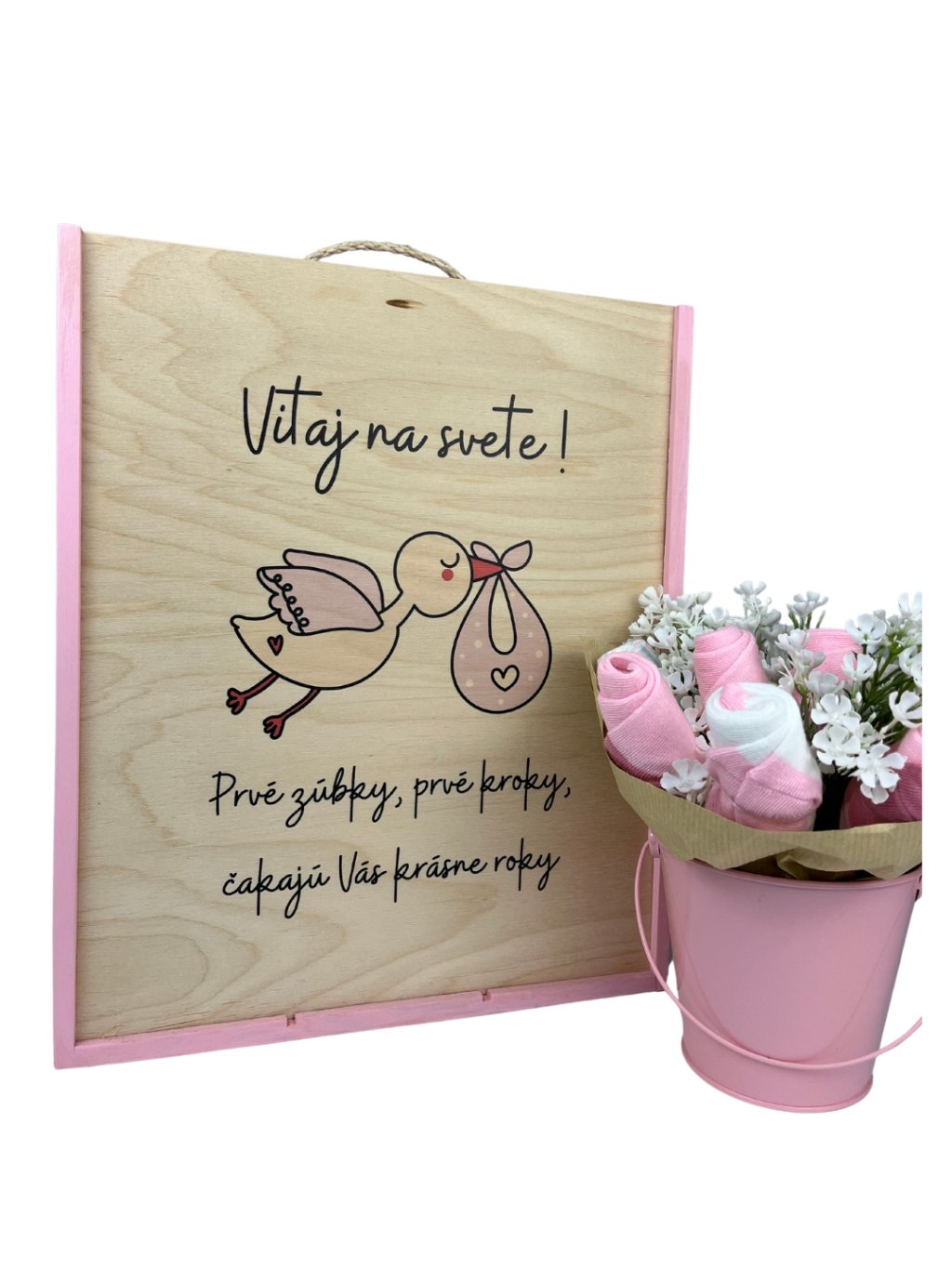 Ponožková kytička z baby ružových bavlnených ponožiek je ideálnym darčekom pre všetky bábätká. Poteší očká a zahreje nôžky. Ružová trojkrabička je doladená ružovým vínom s bocianom a veselými pohármi na víno. Jeden pohár s obrázkom zúbka a druhý pohár s obrázkom nožičiek. Oba poháre vystihujú dôležité míľniky vo vývoji bábätka, ktoré je dôležité osláviť!