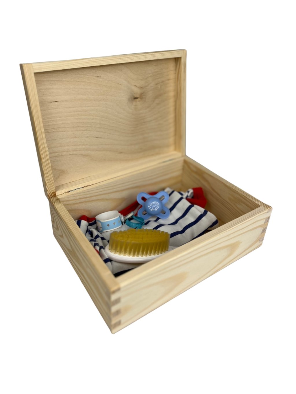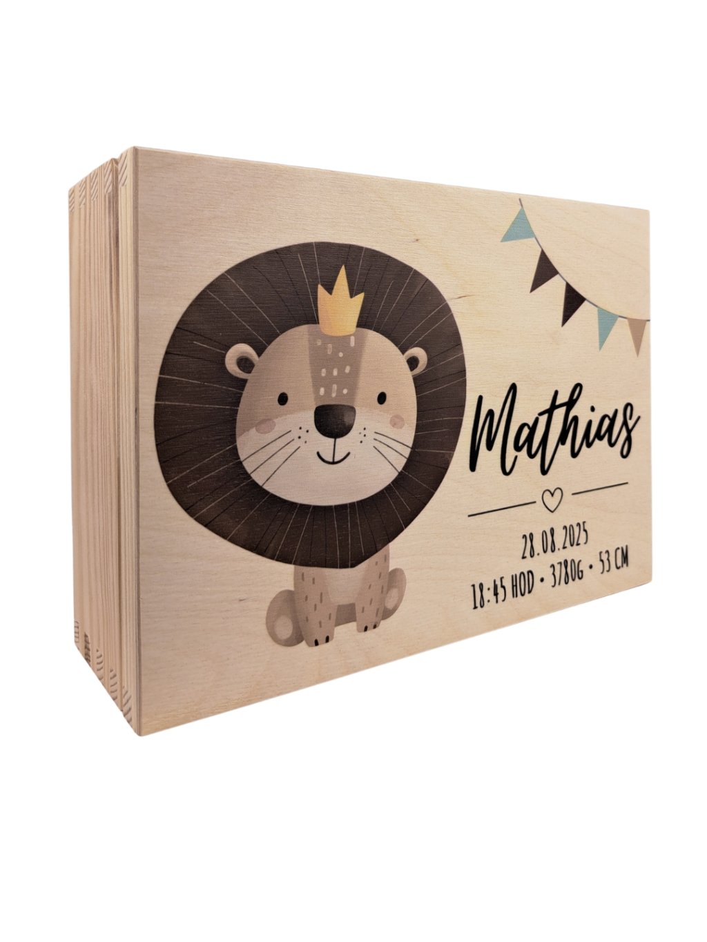 Úložný drevený box pre uchovanie všetkých drobností Vášho dieťatka, na ktoré nechcete zabudnúť. Na vrchnej časti je potlačený motív podľa údajov dieťatka (meno, dátum a čas narodenia, miery, váha či iný krátky text.) a obrázok je prispôsobený pohlaviu dieťatka. Do boxu si viete odložiť spomienky ako snímok z ultrazvuku, prvé fotografie, topánočku, plienočku, časopis, hrkálku, cumlík.. Ideálny darček k narodeniu, krstinám či meninám alebo narodeninám bábätka.
