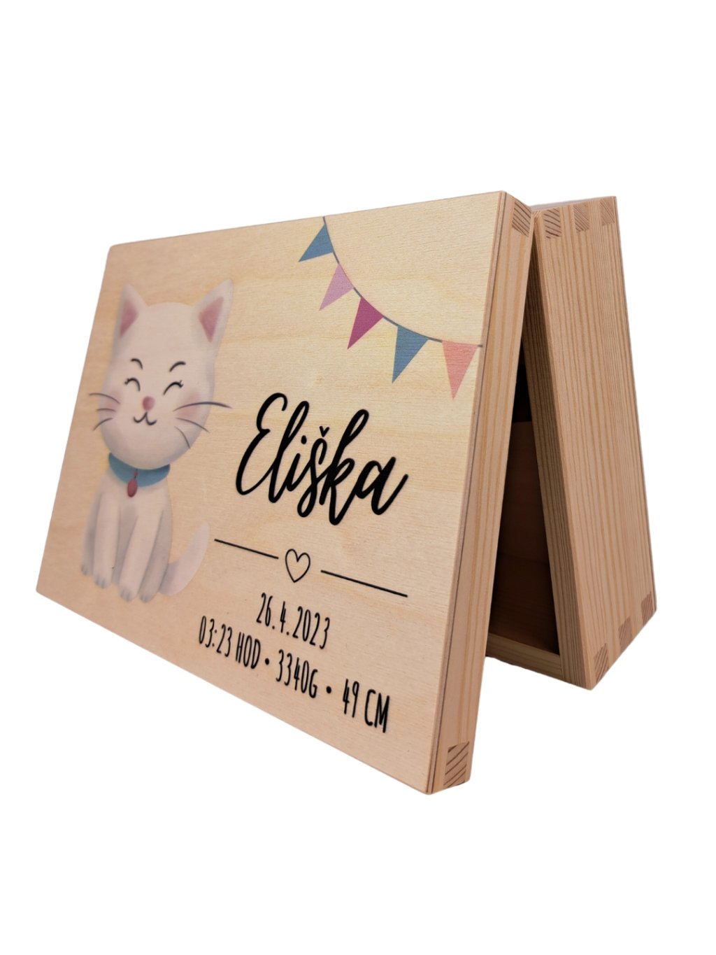 Úložný drevený box pre uchovanie všetkých drobností Vášho dieťatka, na ktoré nechcete zabudnúť. Na vrchnej časti je potlačený motív podľa údajov dieťatka (meno, dátum a čas narodenia, miery, váha či iný krátky text.) a obrázok je prispôsobený pohlaviu dieťatka. Do boxu si viete odložiť spomienky ako snímok z ultrazvuku, prvé fotografie, topánočku, plienočku, časopis, hrkálku, cumlík.. Ideálny darček k narodeniu, krstinám či meninám alebo narodeninám bábätka.