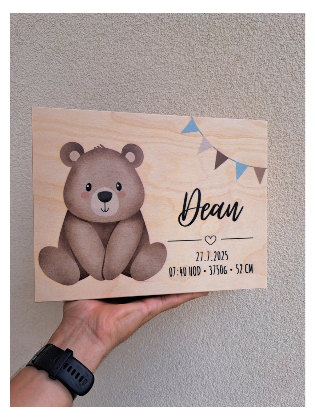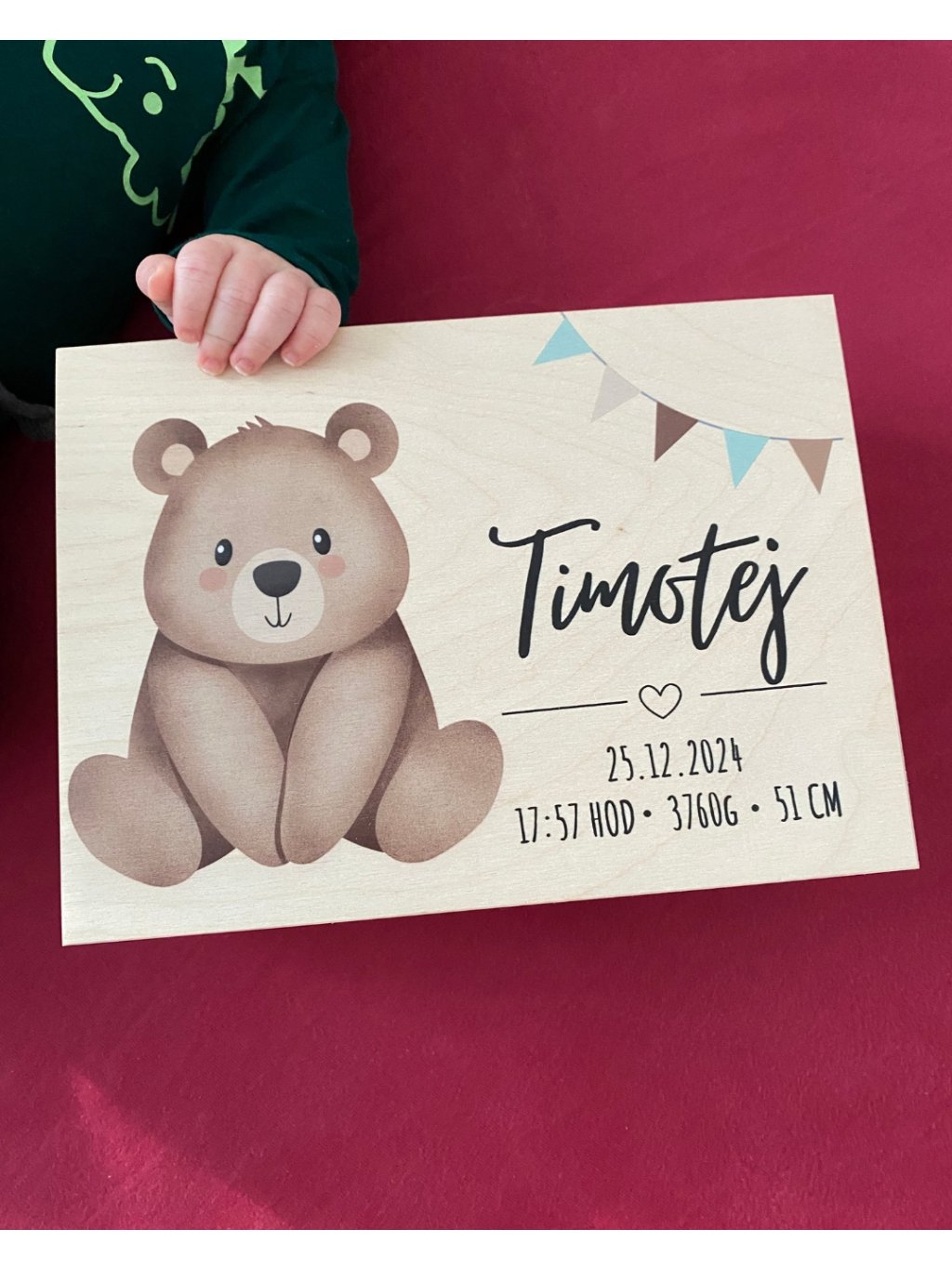 Úložný drevený box pre uchovanie všetkých drobností Vášho dieťatka, na ktoré nechcete zabudnúť. Na vrchnej časti je potlačený motív podľa údajov dieťatka (meno, dátum a čas narodenia, miery, váha či iný krátky text.) a obrázok je prispôsobený pohlaviu dieťatka. Do boxu si viete odložiť spomienky ako snímok z ultrazvuku, prvé fotografie, topánočku, plienočku, časopis, hrkálku, cumlík.. Ideálny darček k narodeniu, krstinám či meninám alebo narodeninám bábätka.