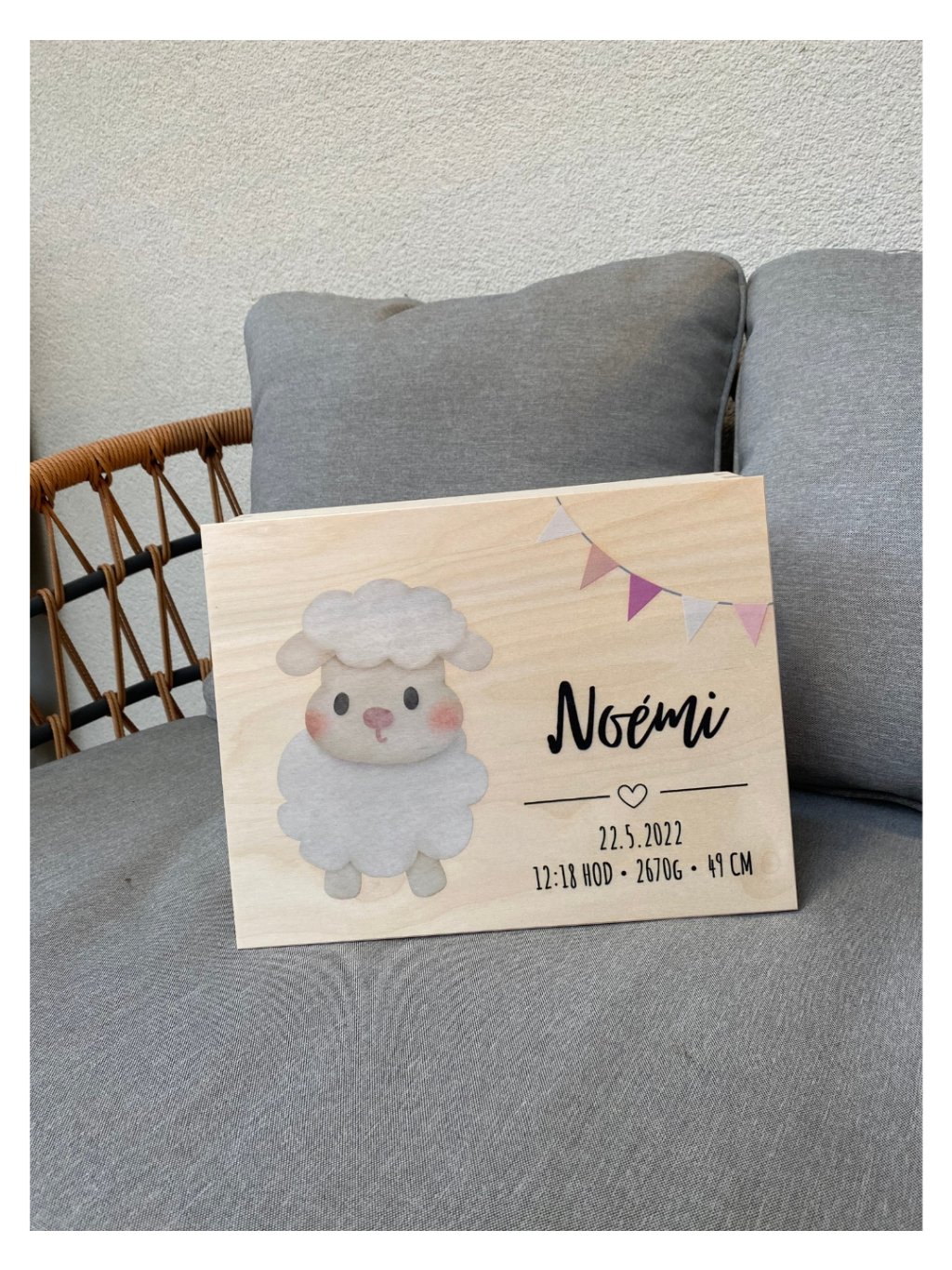 Úložný drevený box pre uchovanie všetkých drobností Vášho dieťatka, na ktoré nechcete zabudnúť. Na vrchnej časti je potlačený motív podľa údajov dieťatka (meno, dátum a čas narodenia, miery, váha či iný krátky text.) a obrázok je prispôsobený pohlaviu dieťatka. Do boxu si viete odložiť spomienky ako snímok z ultrazvuku, prvé fotografie, topánočku, plienočku, časopis, hrkálku, cumlík.. Ideálny darček k narodeniu, krstinám či meninám alebo narodeninám bábätka.