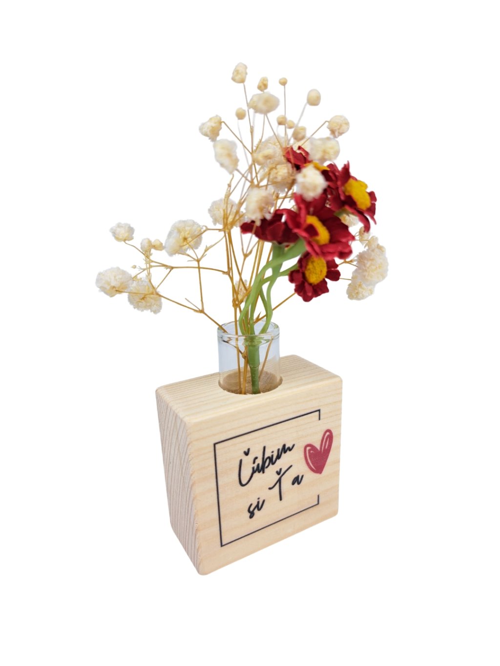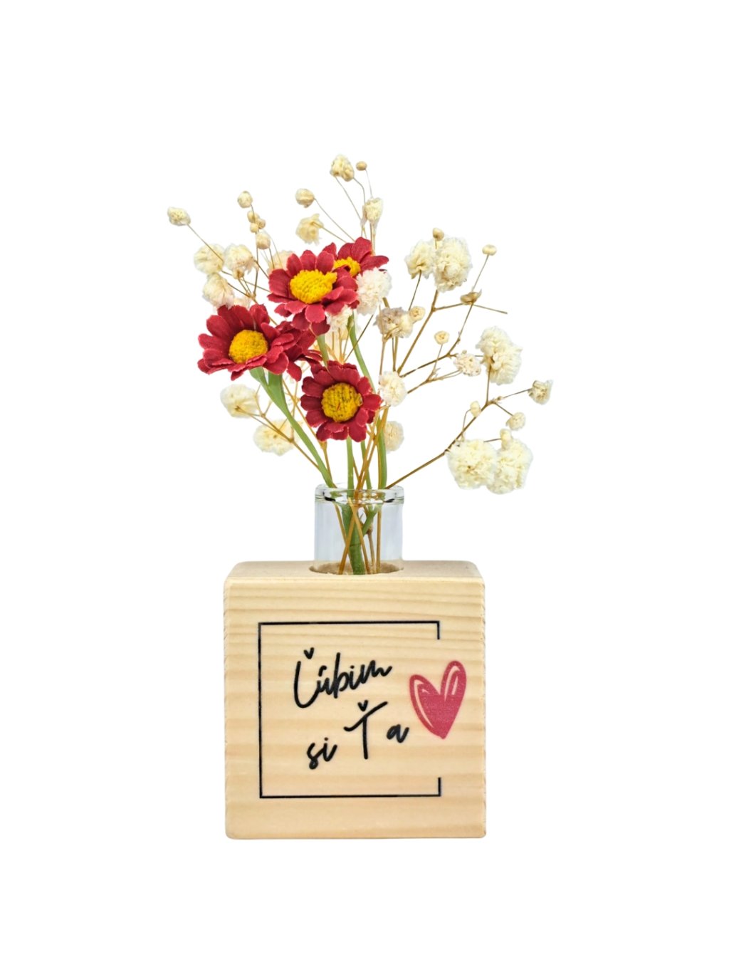 Vázička je potlačená originálnymi citátmi, osobnými odkazmi alebo fotografiou, vďaka čomu sa stáva jedinečným kúskom alebo osobným darčekom. Súčasťou balenia je sklenená skúmavka, určená na drobné kytičky, sušené kvietky alebo kvietky od detí, ktoré nám počas dňa s láskou darujú a ktoré nechceme vyhodiť. Dostupná je v dvoch veľkostiach – 6 × 6 cm a 7 × 7 cm.