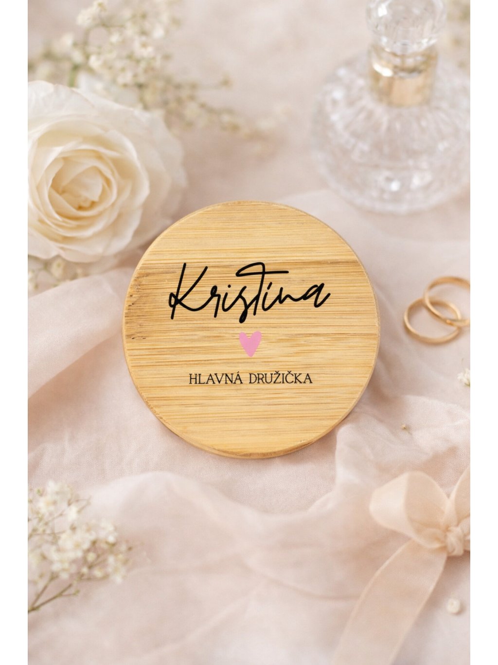 Zrkadielko je možné upraviť podľa želania – doplniť meno a označenie úlohy, ako napríklad svedkyňa (kamoška), hlavná družička alebo družička, prípadne pridať krátky osobný odkaz. Každý kus je tak jedinečný a vyrobený na mieru pre konkrétnu osobu.